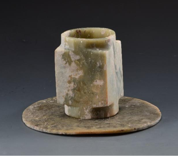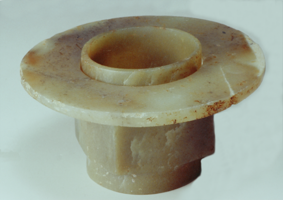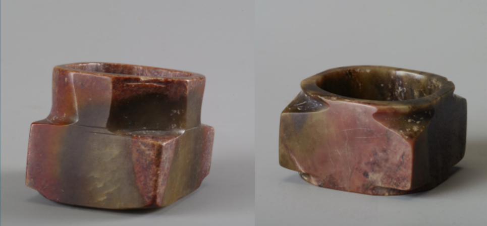 这些玉器长期以来被认为是西周器物,但从材质到不规则的形制及雕琢工艺特征观察,无疑是齐家文化的器物。它们虽然不能套叠使用,但可配对组合。现藏宝鸡市凤翔区博物馆。