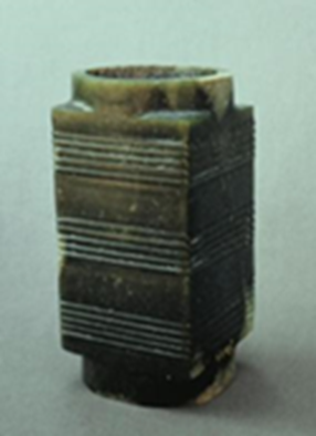 玉琮(编号总0128:2)高4.6~5.2厘米,外方边长5.5~5.7厘米,内径大端5.4厘米,小端4.2厘米,形制一端较规整,另一端四角上部不规整。