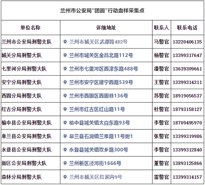 以下为兰州市公安局公布的全市11个DNA血样采集点: